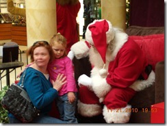 Finally, it was time for Kaitlyn to see Santa. Kaitlyn surprised both of us; she went in to talk to Santa, only this time she sat on his lap all by herself. This was the first time she has ever done this! Usually she has her daddy sit with her while she sees Santa and they take a picture of her, her daddy and Santa. I guess being with Mommy and Nana made her brave enough to do this and get a picture of just her and Santa. Way to go Kaitlyn!
